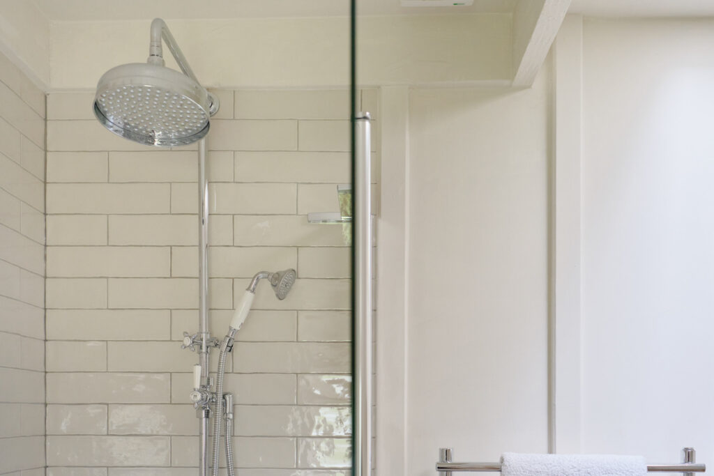 Bathroom The bathroom has a slate floor with a 6 ft bath tub and shower over head, and is found between both bedrooms. Back Click Here to book your stay at the Byre Now!